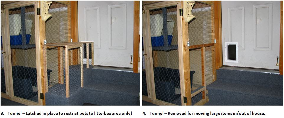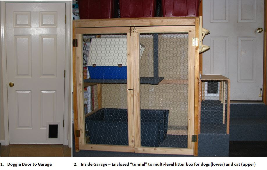 We are currently using a system built in the garage to house both the dog litter-box and cat litter-box. The dogs and cat use a pet door to exit the house, and are confined in the garage by a wire enclosure so they cannot get out or under the cars.